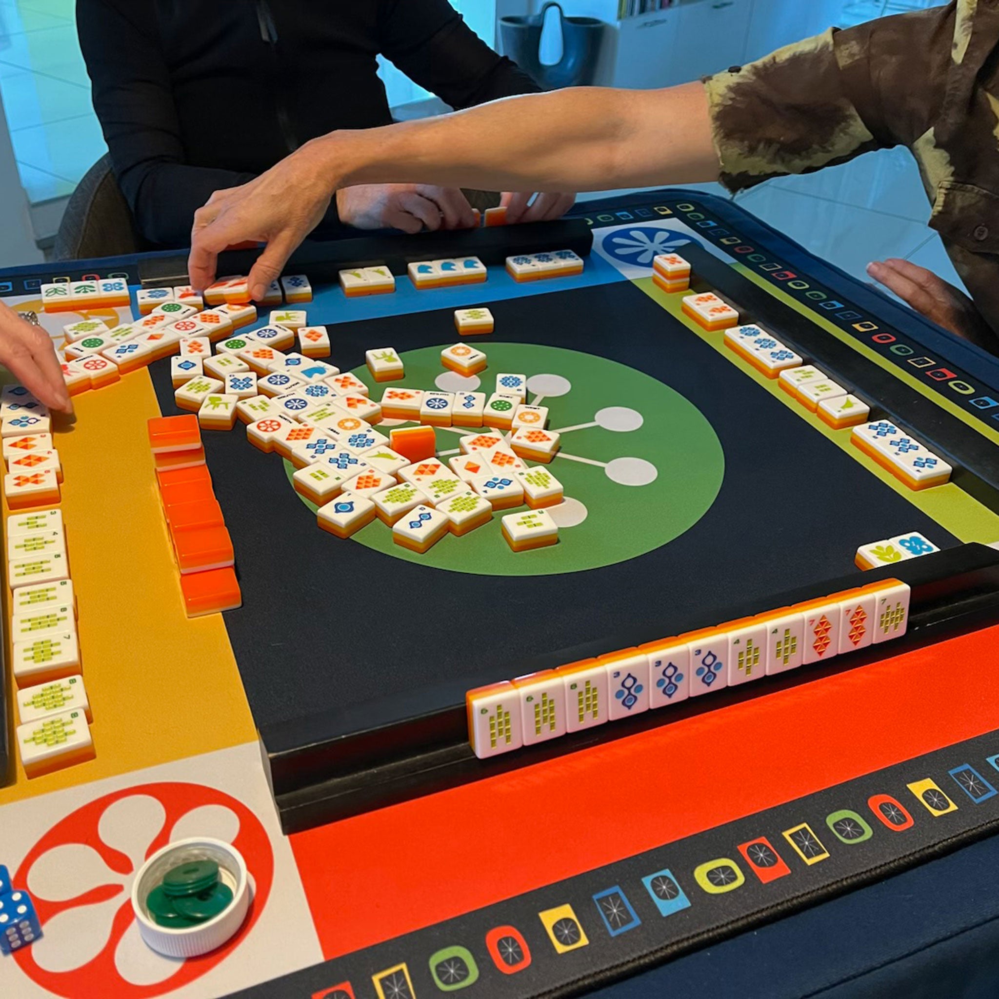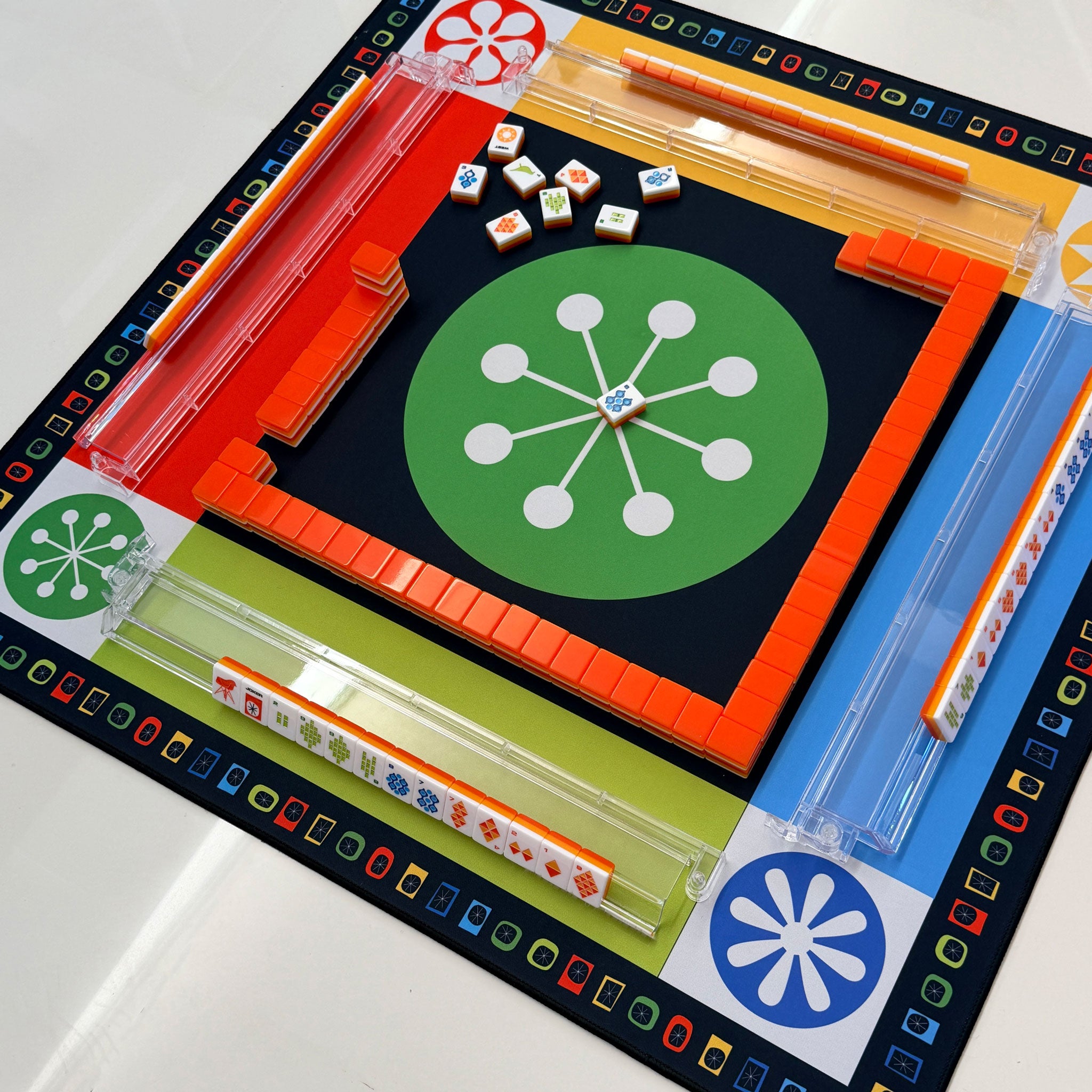 Our modern game mat features a bonded neoprene face, a flexible rubber back, and a carrying bag for easy storage. With its anti-slip backing, it can protect your table from damage and friction from tiles, card racks, play pieces, and more; its dense material reduces noise, too. The perfect mat for people of all ages and ability levels, and for playing mahjong, dominoes, card games, building sets, and board games. Make memories with family and friends with Destination PSP’s exclusive Game Mat! Designed by us, made by us.